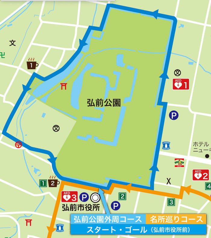 - 弘前城のある弘前公園の外周を走ります。最後は高低差17mの心臓破りの坂が待っている全行程約3Kmを走るルートです。